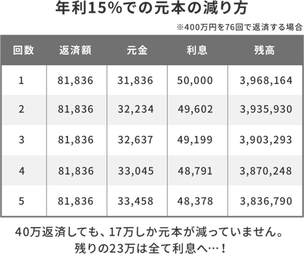 これでは毎月の支払いのほとんどが利息に充てられてしまい、超ハイペースで返済をしない限り、元本を減らすことはほぼ不可能です。
