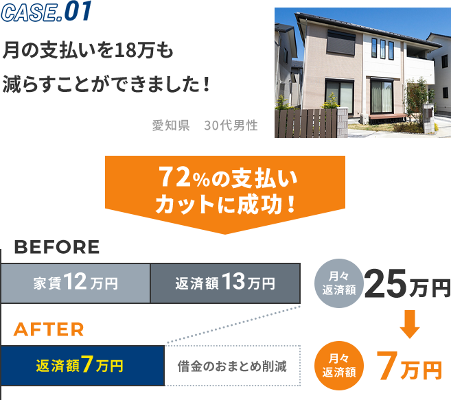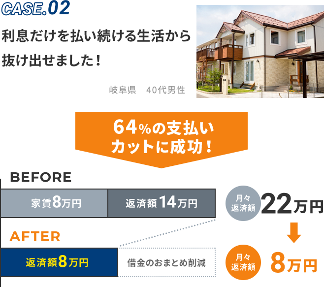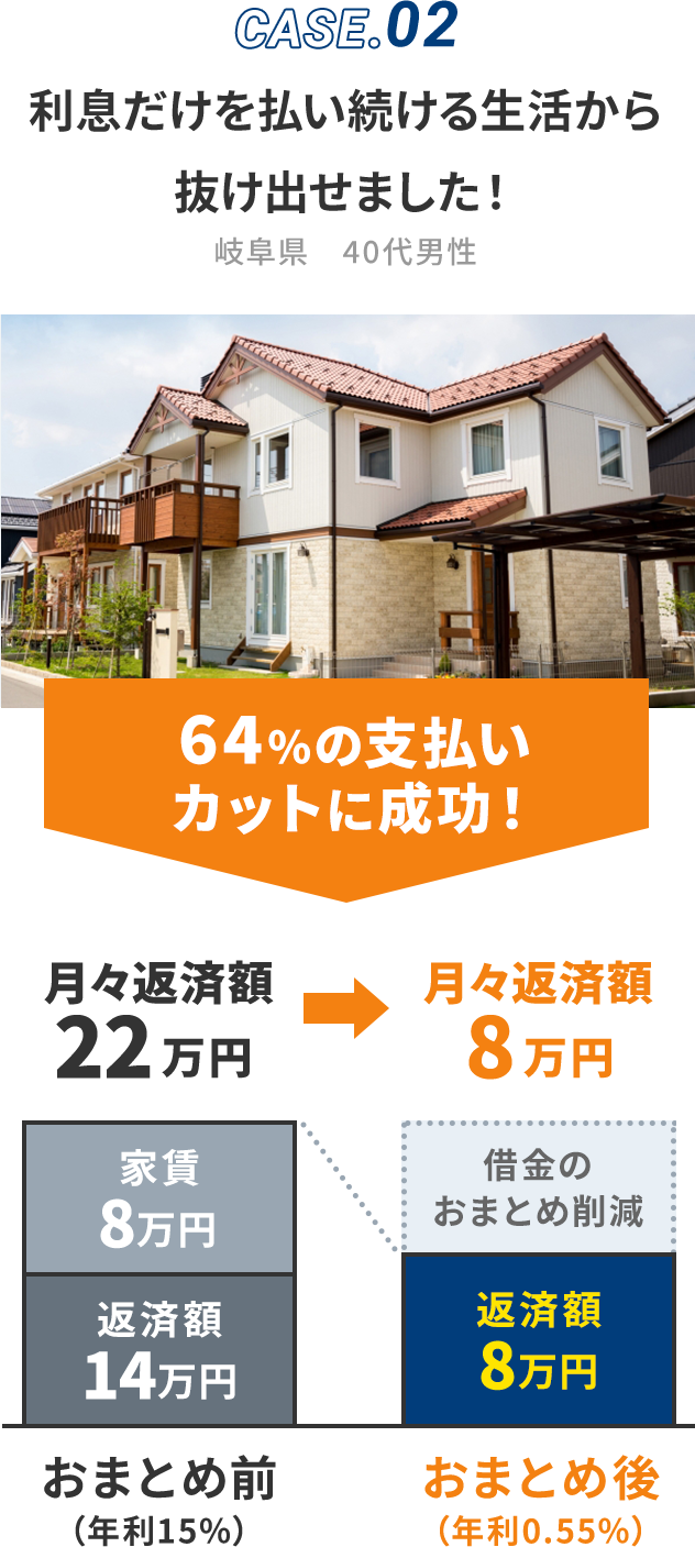 借入額が膨らみ、5年以上利息だけを払い続けてきました。毎月必死に支払いをしても元本が1円も減らず、もう破産しかないか…と考えたのですが、おまとめローンで一本化したところ、毎月の支払いを半分以下にすることができました。