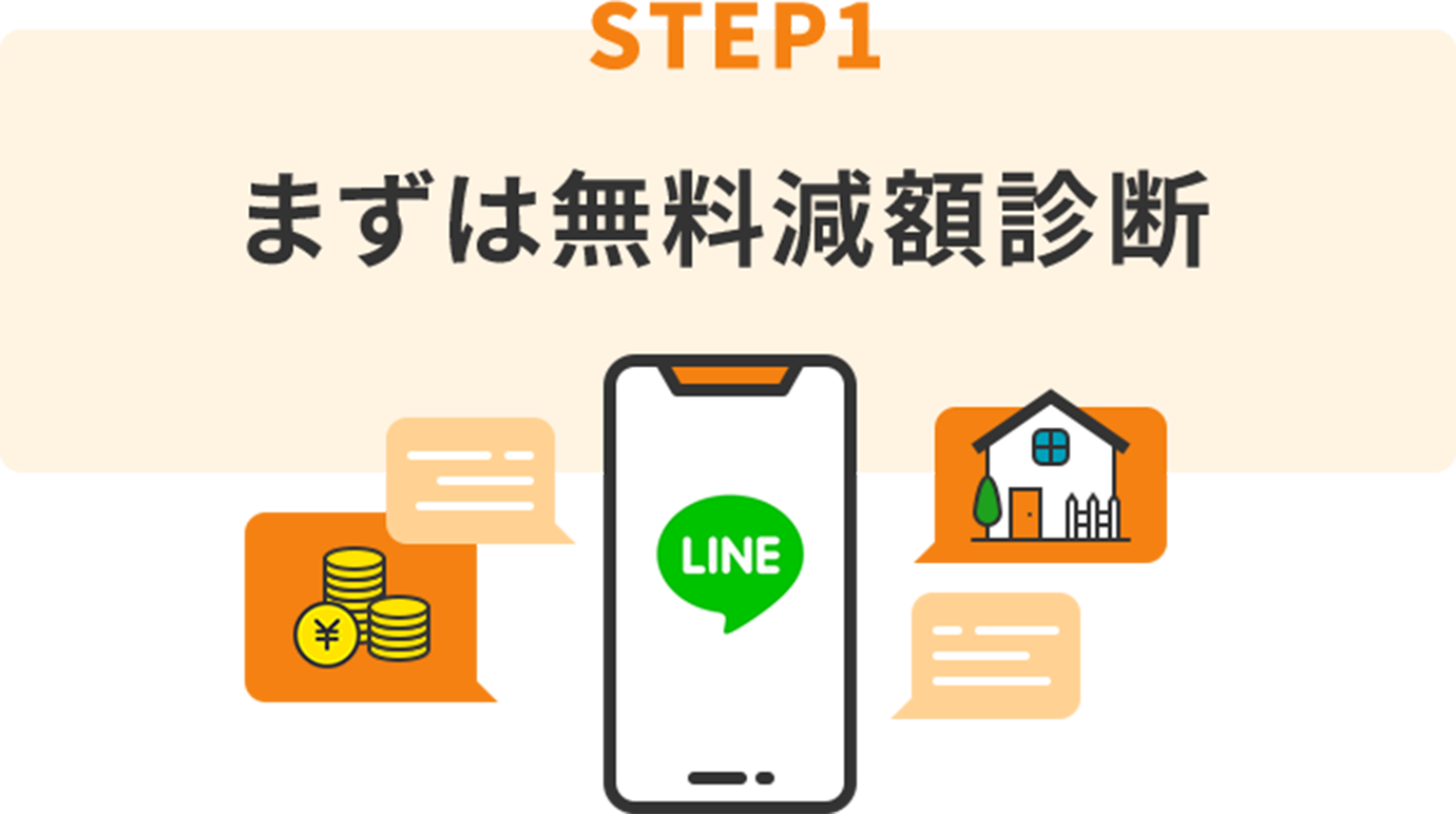 まずはLINEから無料減額診断をお試しください。お客様の今のお借入額や借入の種類などにお答えいただくと、その場で減額可能額の目安が出ます。